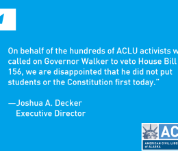 Here in Alaska, our advocacy around free speech has a broad impact: from fighting censorship and English-only laws to ensuring that sidewalks remain a place where people can peacefully protest, the ACLU is there to defend Alaskans against unconstitutional prohibitions on this fundamental right.
